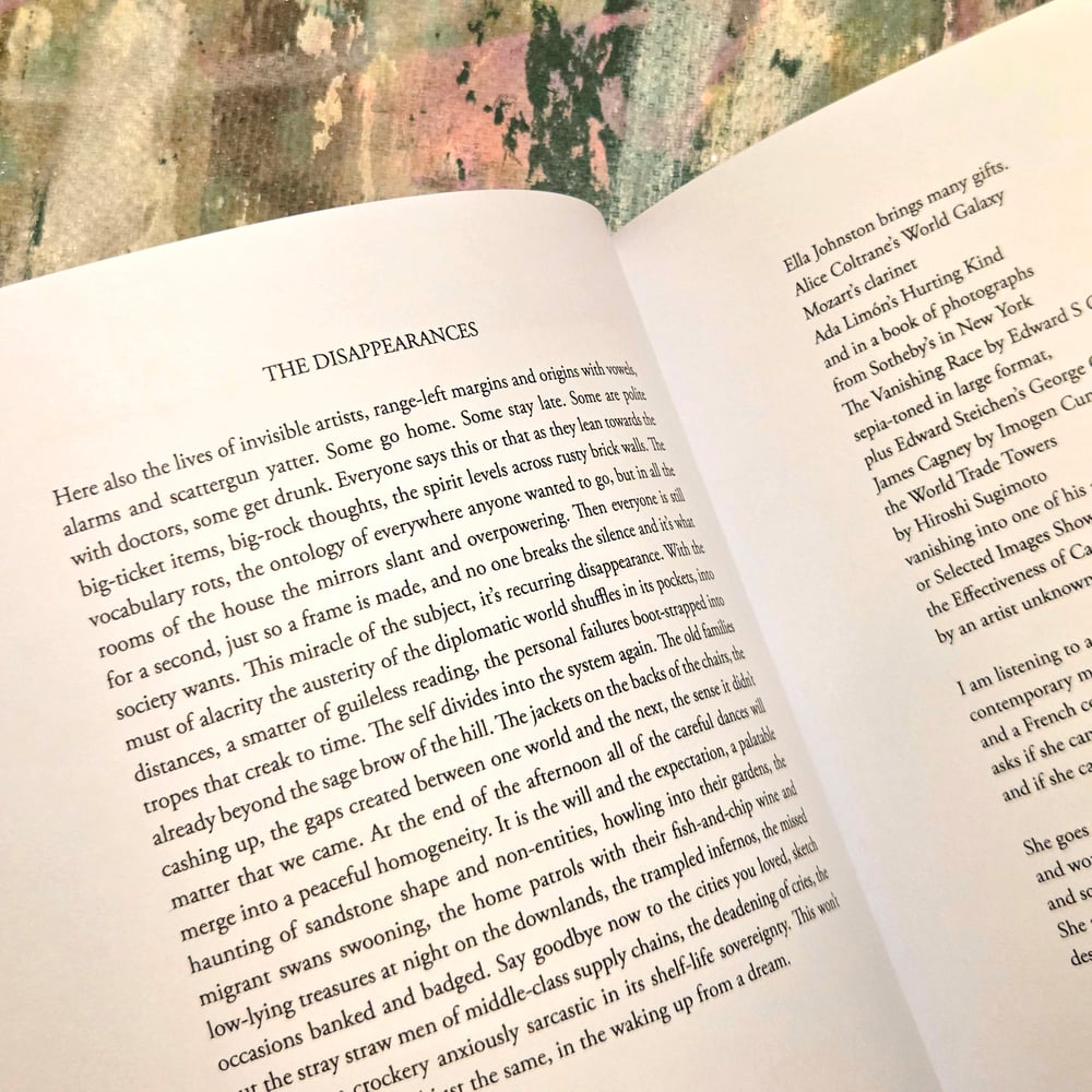 Geographically, the text reverberates with recollections of rural north Essex and the coast of the Irish Sea in Cumbria, with visits to Sheffield, London and Glasgow. Via interviews with the renowned musicians Raphael Roginski and Michelle Moeller we are also taken to eastern Europe and California – to explore contrasting creative traditions. The text gets lost in place, and loses its place, and sees the loss of centre as a positive force for both language and the personal – and writing as a process not of claiming but of giving away.